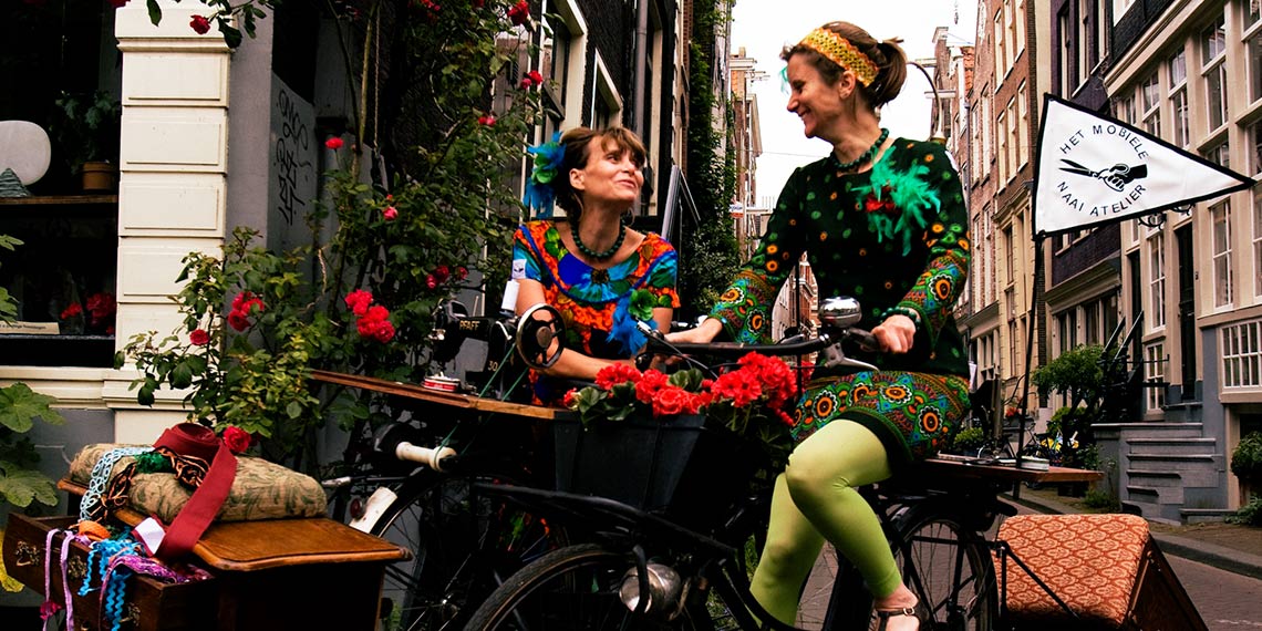 Skilled seamstresses Karin Arts and Marieke Biegman create a unique performance art medium - interactive couture - by having audience members offer their clothes for adaptation with elaborate decoration. The sewers use bikes as their means of transport and to power their sewing machines, with the audience doing the pedalling.