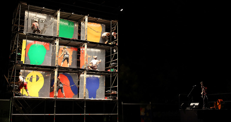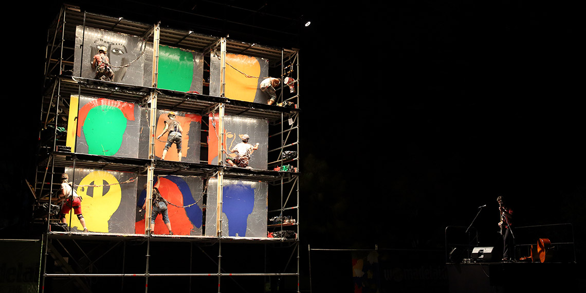 A spectacular performance piece accompanied by live music in which live paintings are created, destroyed and then recreated. Huge stretched canvases over large scaffolding are covered with pictures painted or carved - a collective fresco.