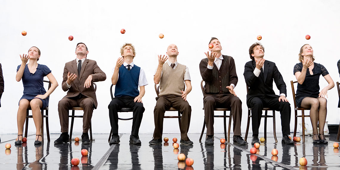 In Smashed, the manipulation of the forbidden fruit takes a sagacious look at the strained relations between seven men and two women, kindly flaying traditional juggling and contemporary circus. A series of nostalgic filmic scenes explore conflict, tense relationships, lost love, and afternoon tea. Inspired by the work of the great choreographer Pina Bausch, director Sean Gandini and Kati Ylä-Hokkala has borrowed elements of her gestural choreography and combined them with the intricate patterns and cascades of solo and ensemble juggling.